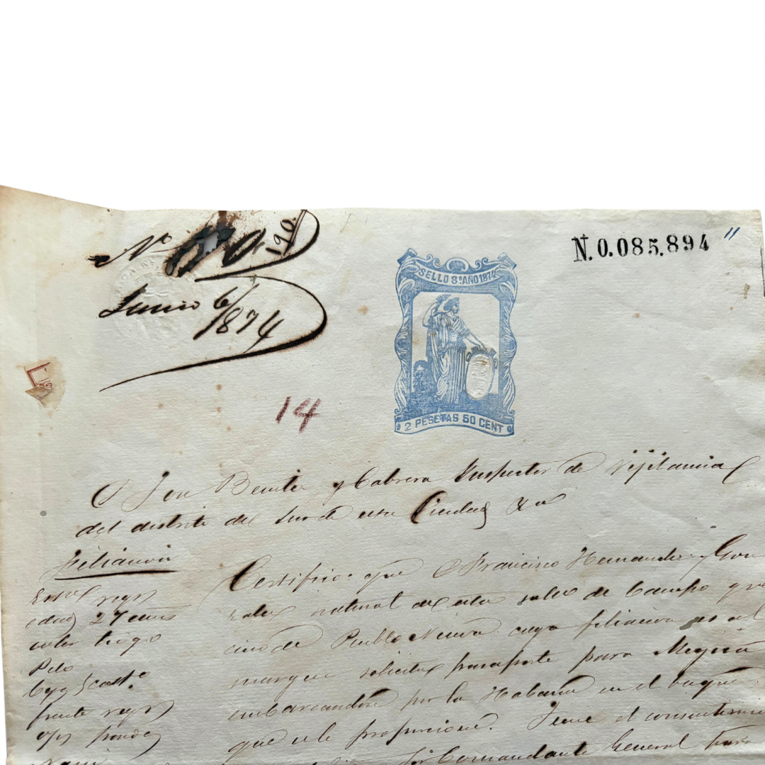 Overall G+. One page, 8½ × 12½ in., ink on official papel sellado (Sello 8.º Año de 1874). Toning, and bends present, and heavy text in the upper left corner slightly torn through. Appropriate to age. Spanish language. Translation completed by online software.