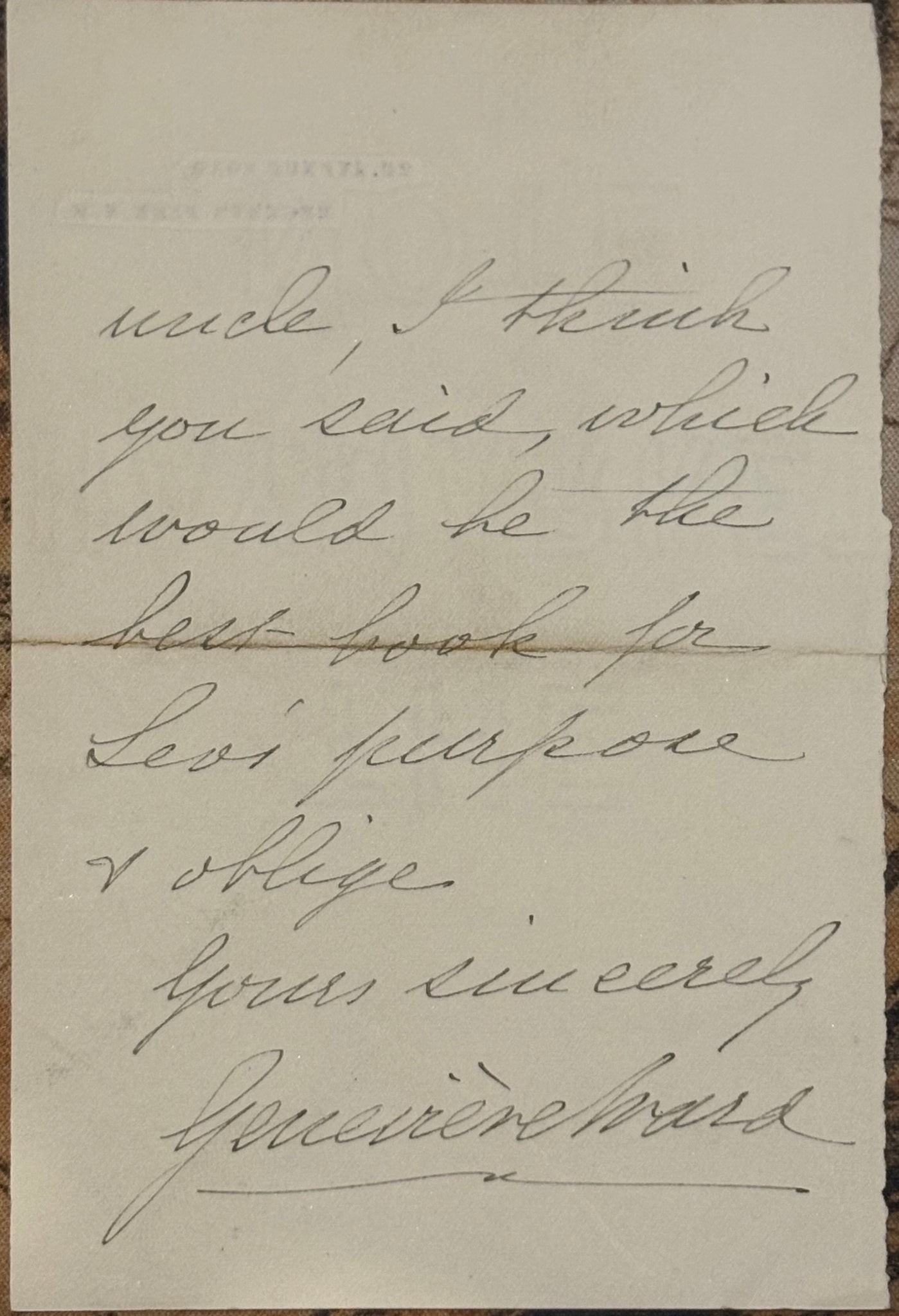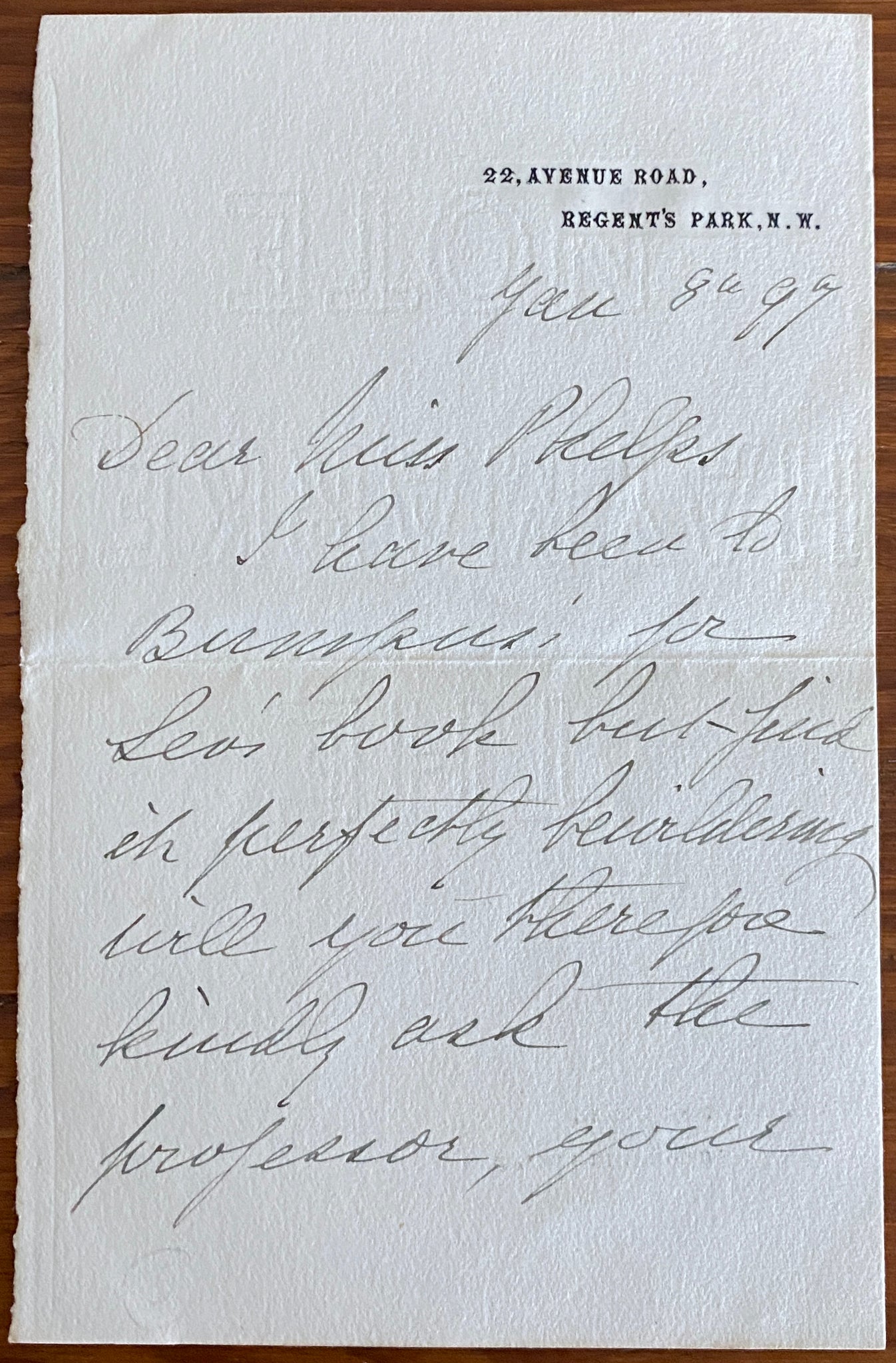 On offer, a letter from Geneviève Ward to a friend Miss Phelps (possibly Miss Laura B. Phelps, violin virtuoso) Written upon 22 Avenue Road, Regent's Park N.W. letterhead. Dated Jan. 8th, 97, Ward asks Miss Phelps to confer with a professor, who she mentioned was her uncle, to determine what book he would recommend to suit Leo’s purpose in office.