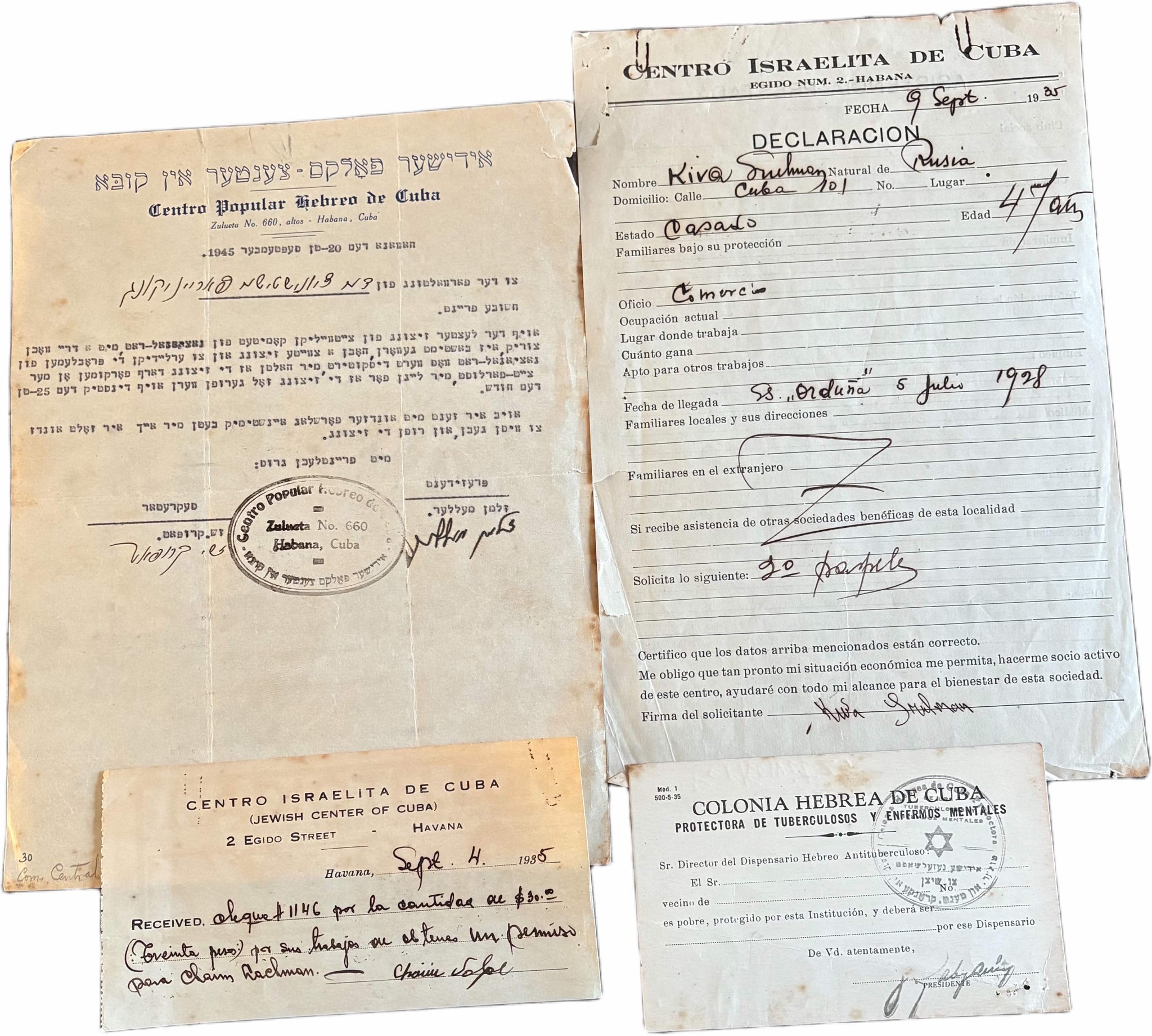 The earliest document, dated September 4, 1935, is a Centro Israelita de Cuba receipt acknowledging “cheque No. 1146 for the amount of $30, for your work in obtaining a permit for Chaim Rachman,” signed by what appears to read Chain Safol. Its dual-language layout and official seal exemplify the Centro’s role as both civic intermediary and moral guarantor within Havana’s immigrant quarter—a hub where legal, religious, and welfare needs converged under one roof.