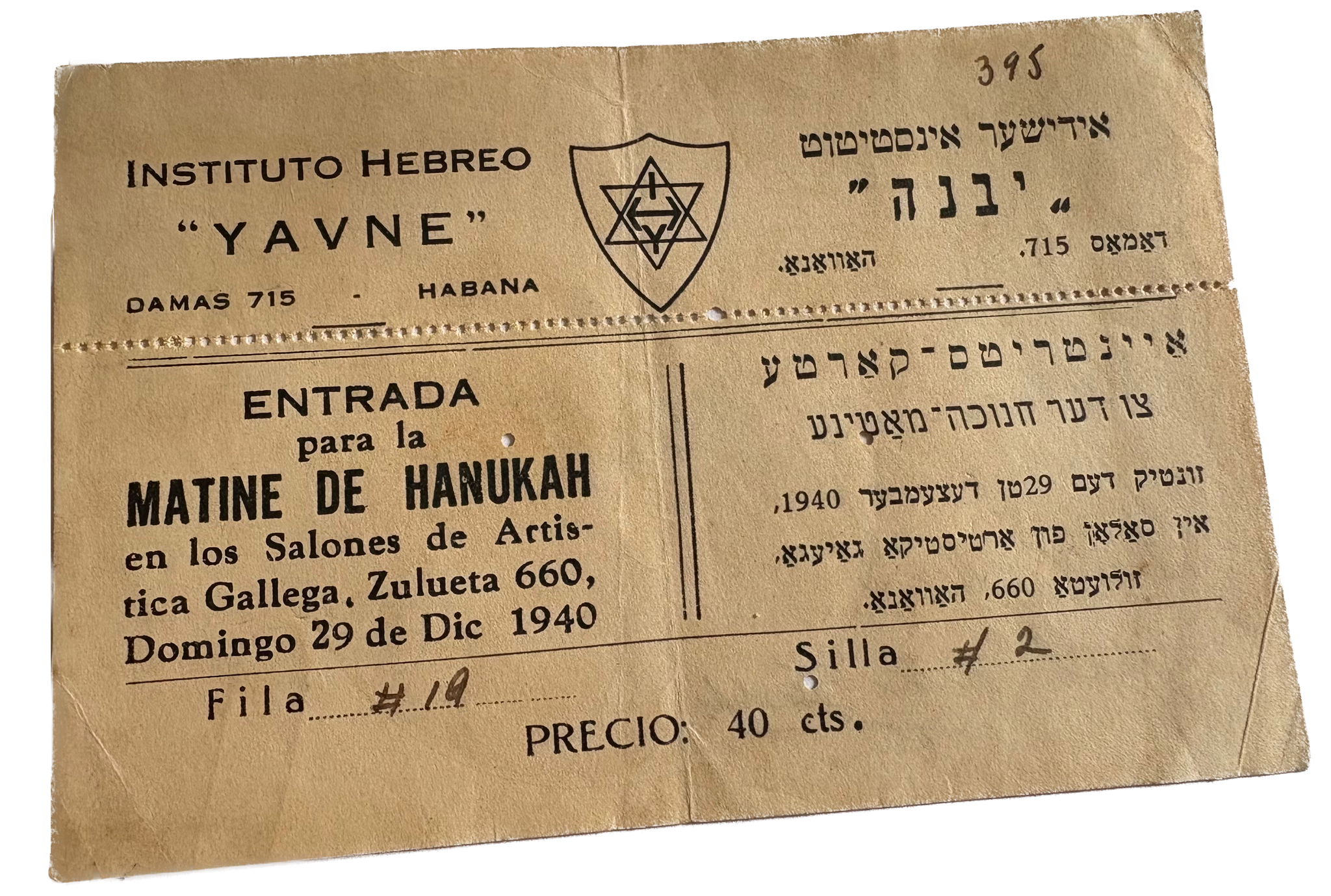 Equally evocative is an admission ticket to the Hanukkah Matinee organized by the Instituto Hebreo “Yavne,” held on December 29, 1940, in the Salones de Artística Gallega, Havana. Printed in both Spanish and Yiddish, and naming Yavne’s headquarters at Damas 715 – Habana Vieja, the piece offers a rare, tangible window into the communal and educational heartbeat of pre-war Jewish Havana. The Yavne Institute, founded by Eastern-European immigrants in the late 1930s, was dedicated to Hebrew instruction, cultural renewal, and the transmission of Jewish values to the next generation. In the tense early months of World War Two, when refugee arrivals, political uncertainty, and economic strain touched every household, this simple 40-centavo ticket invited families to a public celebration of Hanukah, the festival of resilience and light. Its bilingual design mirrors the social duality of the community itself: Yiddish for the immigrant parents, Spanish for their Cuban-born children. This simple piece captures so directly how Havana’s Jews forged cultural continuity through performance, education, and joy. Within this manuscript lot, the Yavne ticket anchors the transition from bureaucratic organization to lived experience, transforming the archive from a record of institutions into a portrait of a functioning neighborhood civilization.