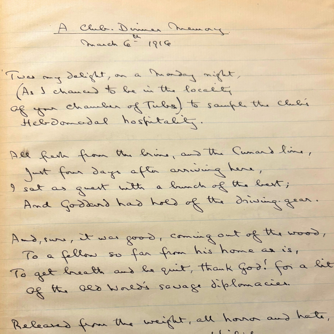 Between these public statements and his first scheduled lecture at the National Arts Club on March 8, 1916, Housman attended a convivial Monday gathering, memorialized in this poem, framed as an after-dinner toast yet weighted with moral urgency. The poem simultaneously honours and appeals to his American contemporaries.
